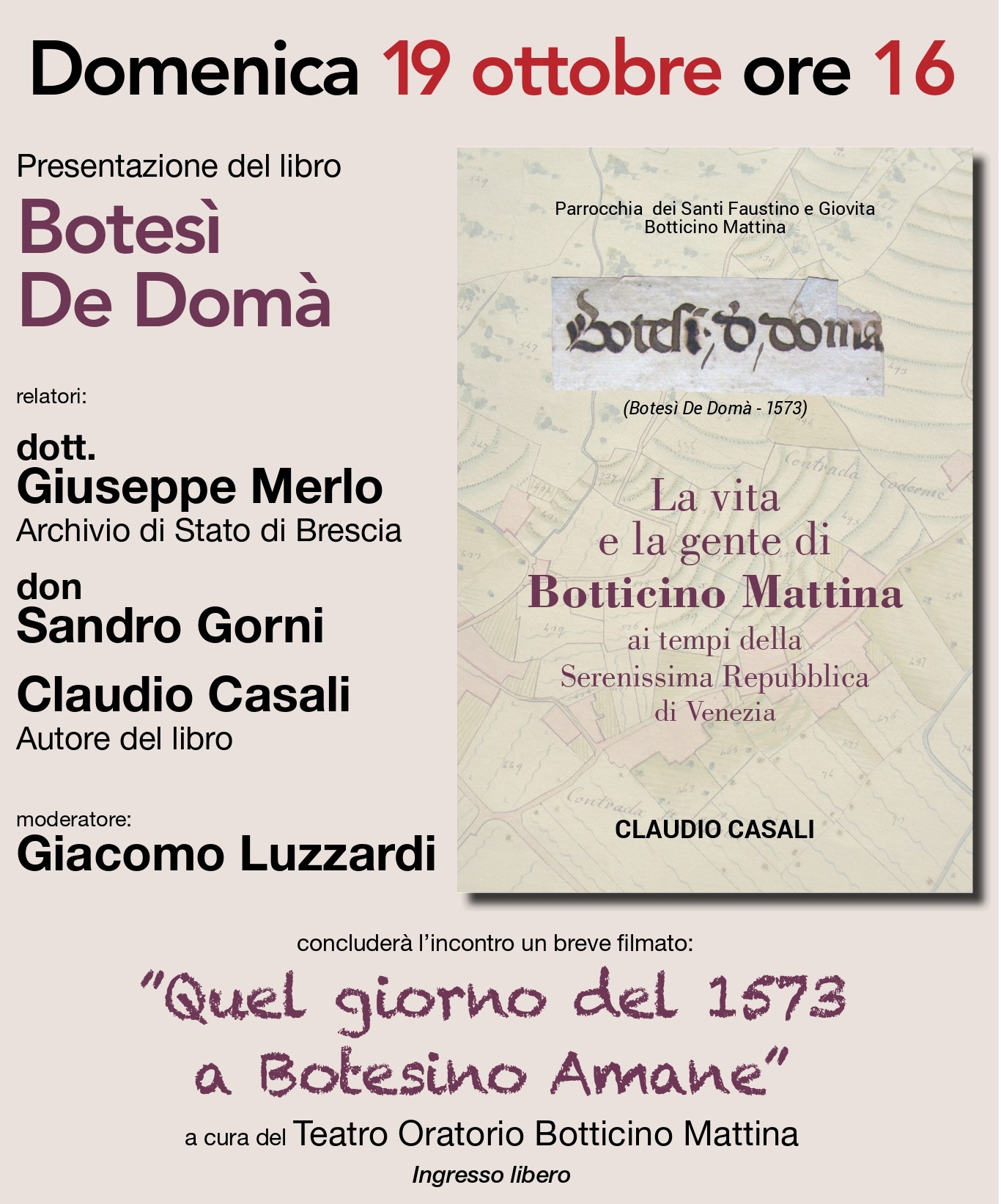 A conclusione dell’incontro verrà proiettato il breve filmato “Quel giorno del 1573 a Botesino Amane” a cura del Teatro Oratorio Botticino Mattina.